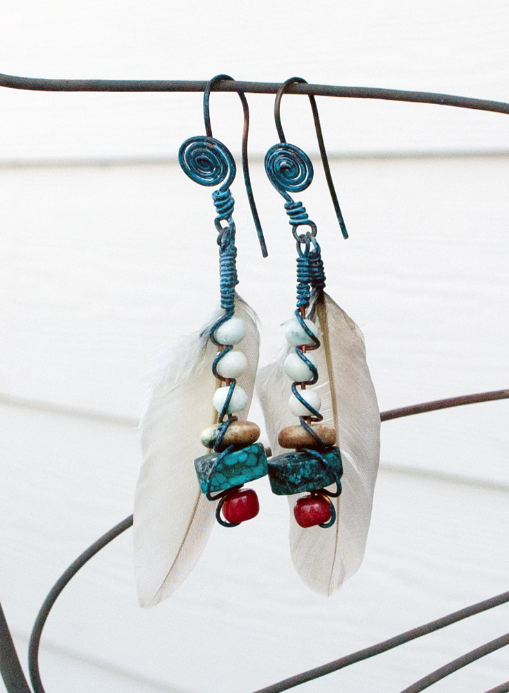 To the Alaskan feathers and bone beads, I added red bamboo corral that I had, and the sweet turquoise disks I won, all entwined in copper, hung on my own made copper ear wires. I loved them when I finished making them, but felt they needed just a little more *something*. The copper was just a little too bright, too distracting. LOS was out of the question, as was Perma Blue, since I didn’t want the feathers to be damaged. Then I remember a technique I had seen used on the Jewelry and Bead Lovers Facebook group by one of the members. Ammonia! I dabbed salt water over the exposed copper, laying it on pretty thick-I could see salt grains in some spots. Then, using Fireline strung through the shaker holes of an old, large spice container on which I hung the earrings, I poured half an inch of ammonia in the bottom of the container and set it on the back patio. A few hours later, I was elated to find the beautiful blue patina-that matches the turquoise perfectly! It’s really interesting to see a blue tinge developed in some spots on a few of the white bone beads, and the feathers took on a slightly aged look. I rinsed the earrings in cold water, rubbing the copper areas clean, and used a blow dryer to dry the feathers. I call them Dancing Feather, because they make me think of Sherry of Sherry’s Jewels. I will let you conjure up your own ensembles for these. 🙂