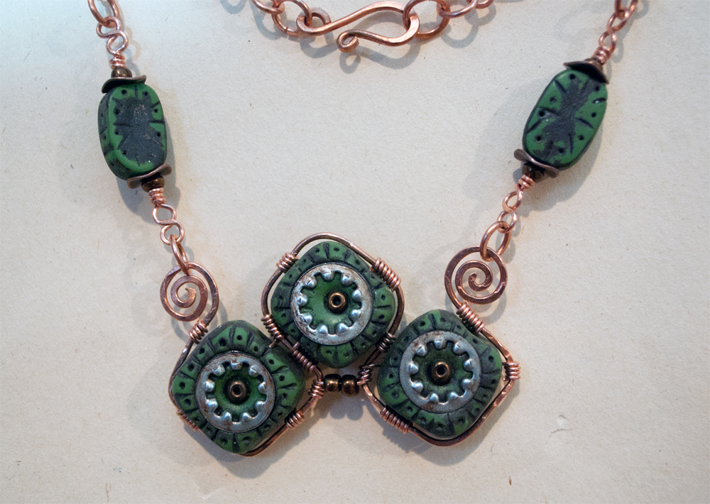 Wound in copper with coils, each bead received special attention, and stands out on its own. They are brought together with heavy 14 gauge jump rings. I chose to use two strands of chain-an antiqued copper and an antiqued brass, which are joined to the beads by means of figure eights I also fashioned. The piece ends in a heavy duty, hand forged clasp. I added a light patina and buffed. I didn’t realize at the time that my pictures of this piece weren’t clear. I’m not sure what happened there, so I apologize. I think this is my favorite of the two necklaces I made, and I have a feeling it will get tons of wear! I see it dressing up my usually slovenly appearance of jeans, faded teeshirt and running shoes by adding a touch of bohemian class.